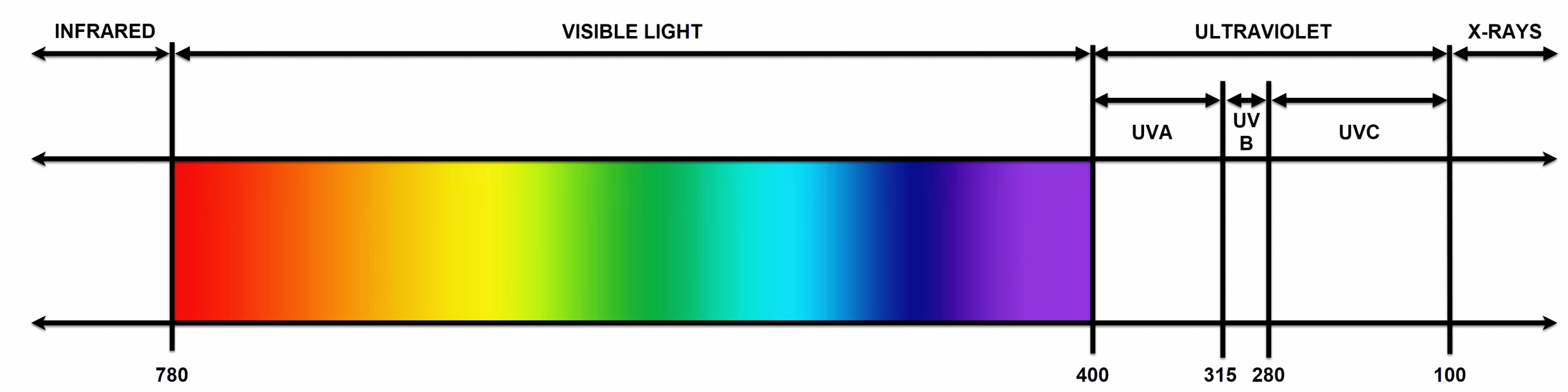 - UV-A (315 – 400 nm), sometimes known as ‘black’ light;